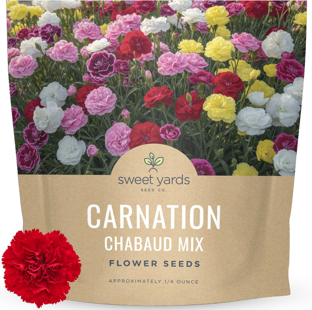 • CARNATION CHABAUD MIX: It features double, fringed flowers in pinks, reds, and whites. Known for their fragrance, these are excellent for cutting and thrive in well-drained soil.