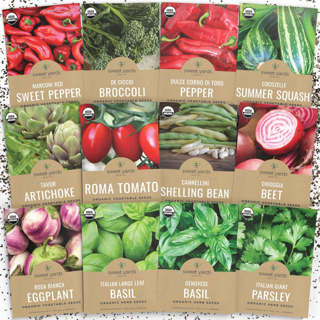 - 12 INDIVIDUAL SEED PACKETS: Genovese Basil, Italian Large Leaf Basil, Chioggia Beet, De Ciccio Broccoli, Dulce Corno Di Toro Sweet Pepper, Rosa Bianca Eggplant, Cannellini Shelling Bean, Italian Giant Parsley, Cocozelle Summer Squash, Marconi Red Sweet Pepper, Tavor Artichoke, Roma Tomato.